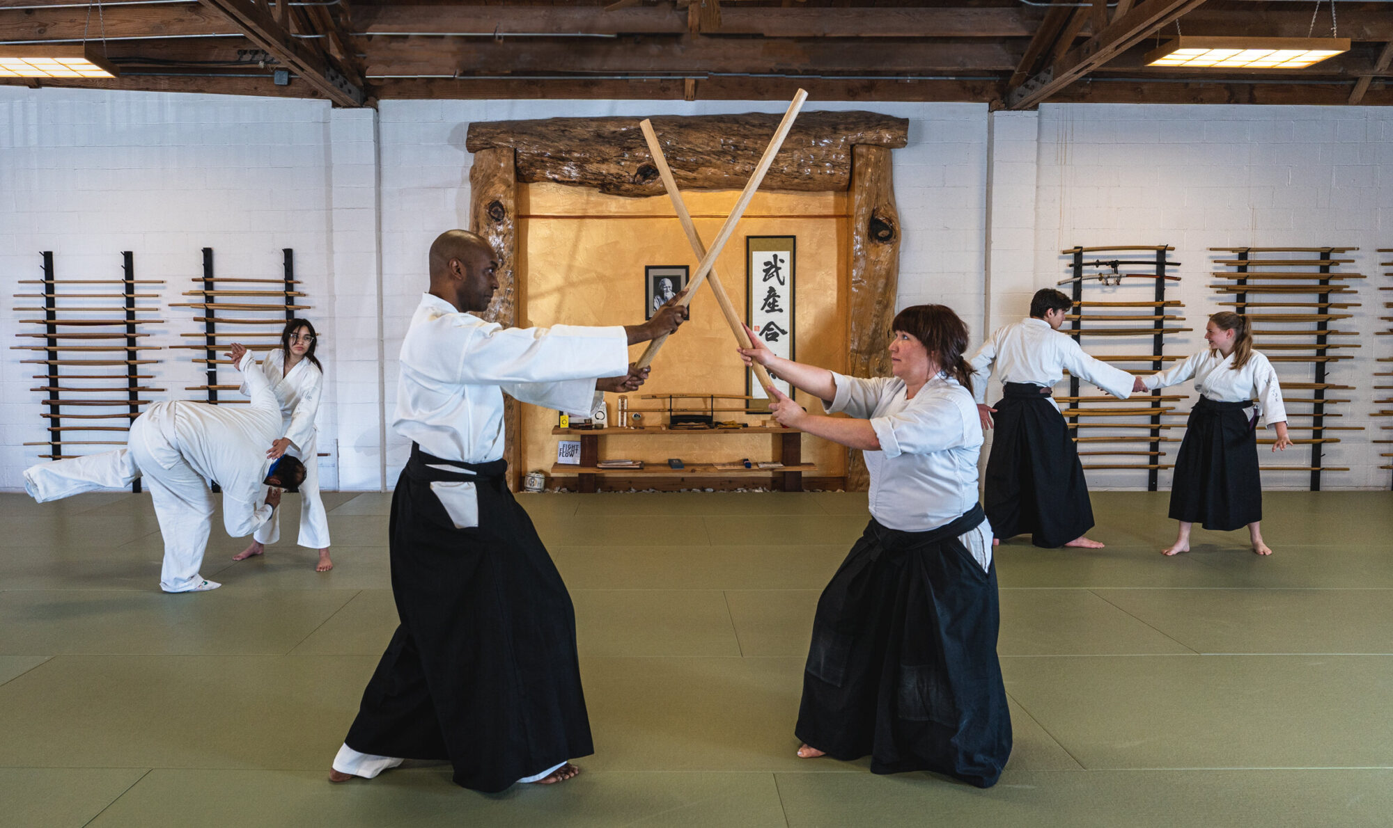 Da queste basi si sviluppa l’Aikido, che si può praticare a mani nude o con strumenti offensivi come bastoni o spade. Durante le lezioni vengono insegnate una serie di tecniche per rispondere a presunti attacchi di una o più persone, che possono utilizzare armi, pugni, calci, prese, soffocamenti. Tali tecniche spesso sfociano in blocchi, immobilizzazioni, movimenti dinamici in cui l’attaccante viene lanciato per terra.
